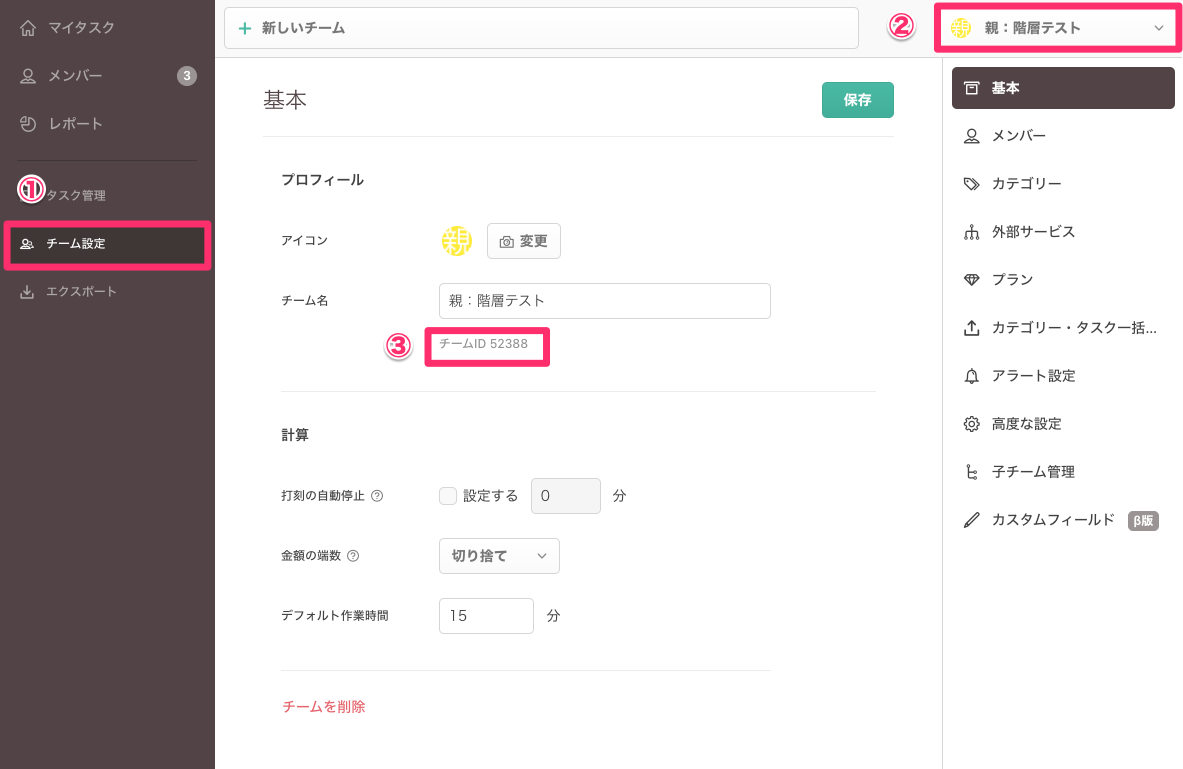 1. ①チーム設定をクリックし、②該当チームの③チームIDを確認する