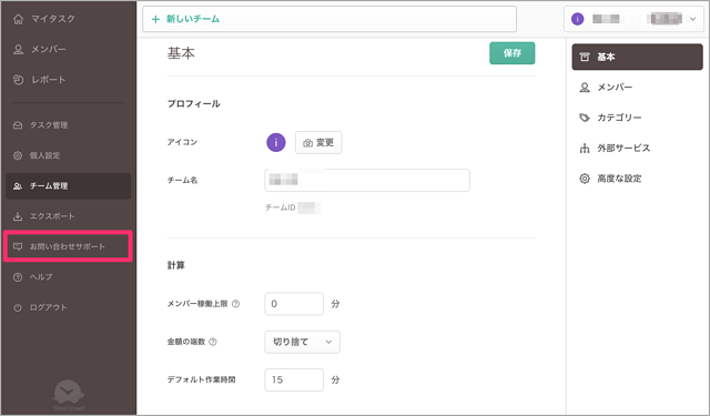 2. 「お問い合わせサポート」をクリックし、該当チームIDを伝える