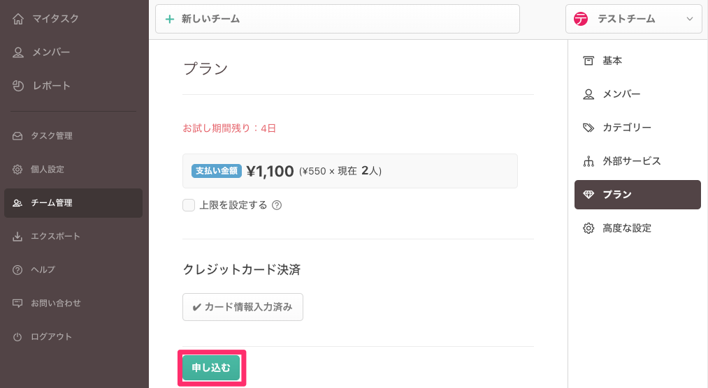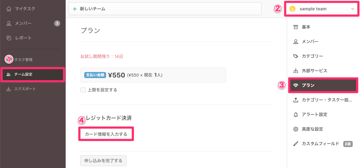 1. チーム設定へアクセスし、該当チームのプランタブを選択した後、「カード情報を入力する」をクリック
