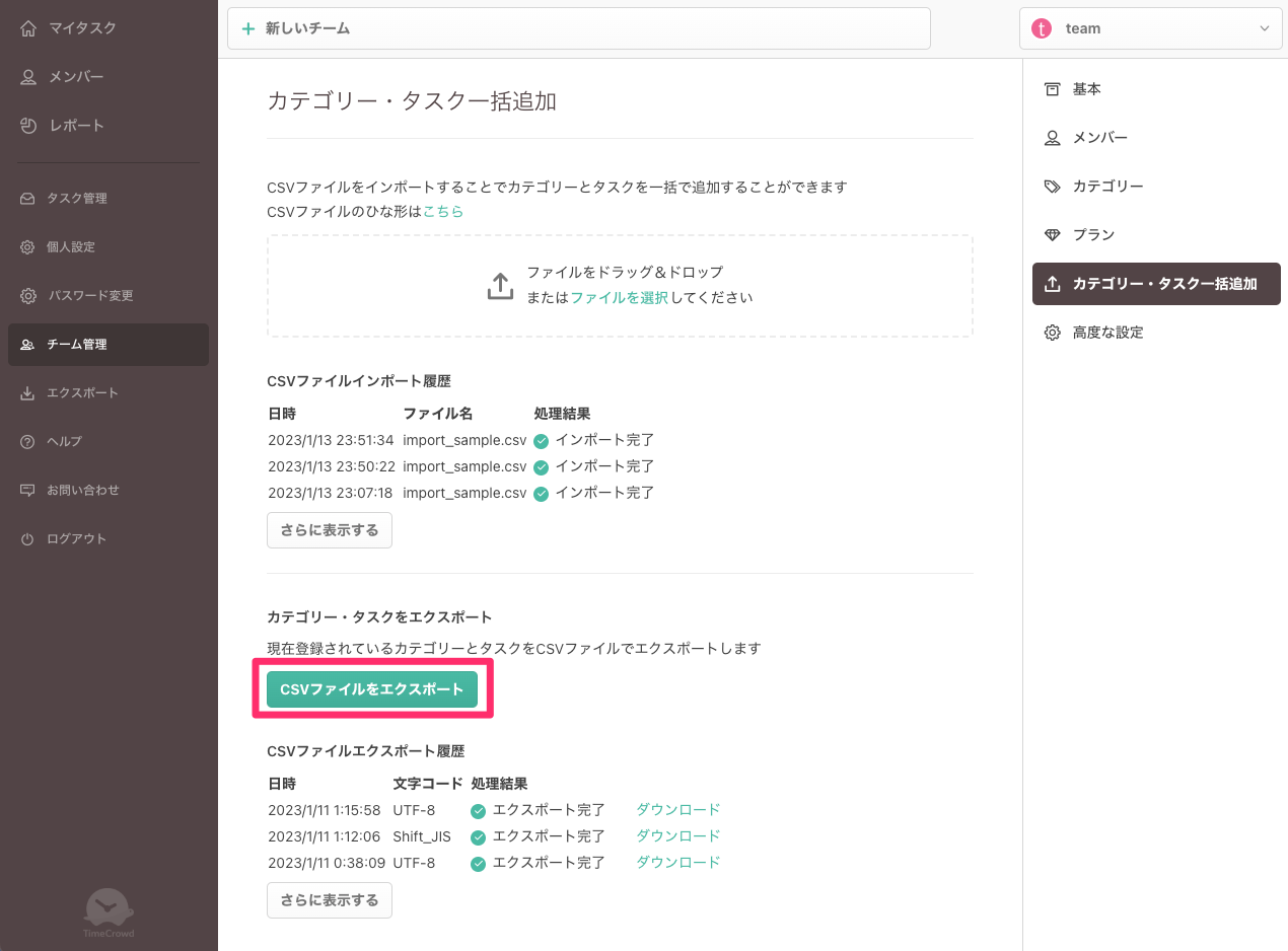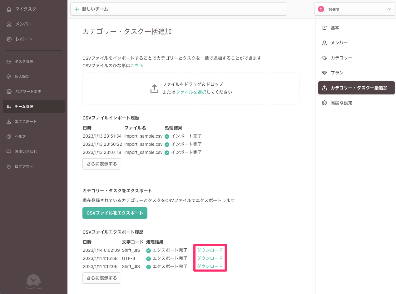 「カテゴリー・タスク一括追加」ページにて、エクスポートしたCSVファイルがダウンロードできます
