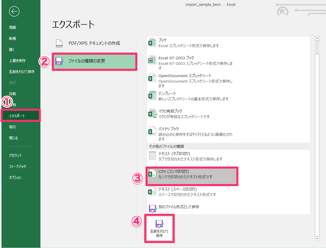 エクスポート>ファイルの種類の変更>CSV(コンマ区切り)>名前を付けて保存の順番にクリックして保存します。