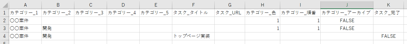 CSVファイルに追加したいカテゴリーとタスクの情報を記載します。