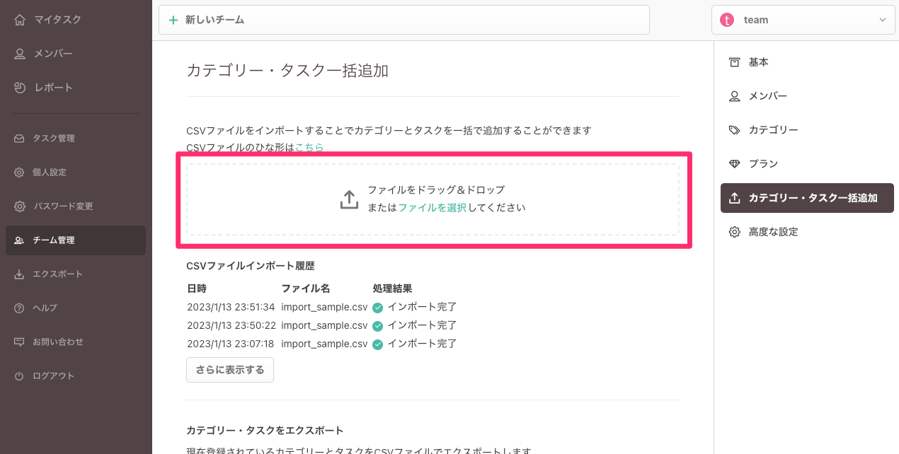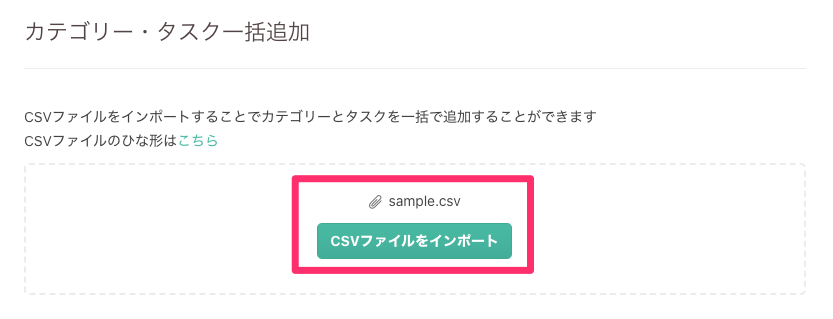 - 「チーム設定>カテゴリー・タスク一括追加」を開き、点線部分に作成したCSVファイルをドラッグ&ドロップまたはファイルを選択から作成したCSVファイルを選択