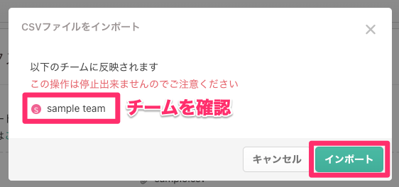- インポート先のチームをご確認いただき、誤りがなければ「インポート」ボタンをクリック