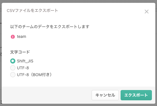 エクスポートするチームをご確認いただき、文字コードを選択(Excelをご利用の方はUTF-8(BOM付き)をご利用ください)、エクスポートボタンをクリック