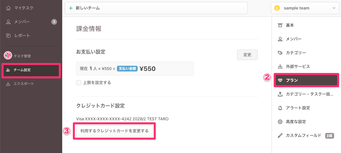 1. チーム設定>プランから「利用するクレジットカードを変更する」ボタンをクリック