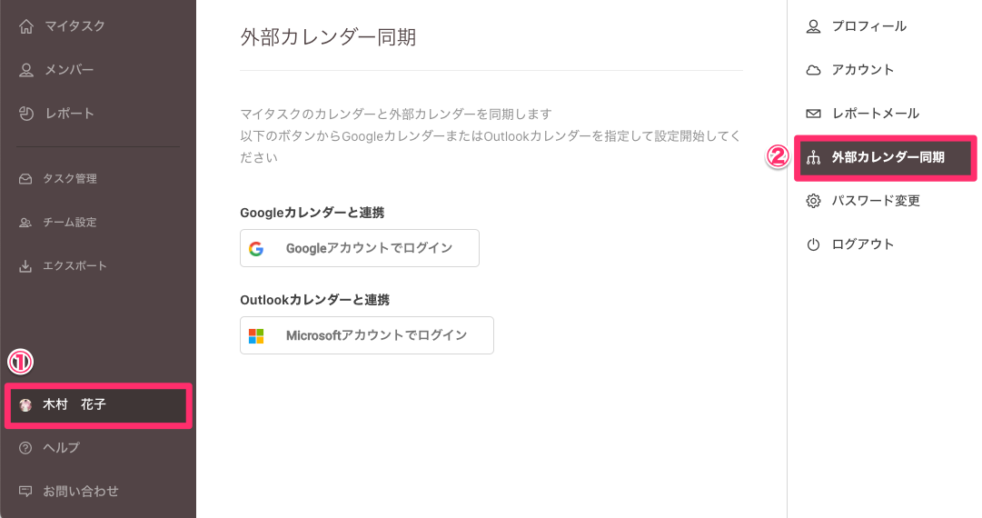 メニューの①個人設定→②外部カレンダー同期をクリックします。