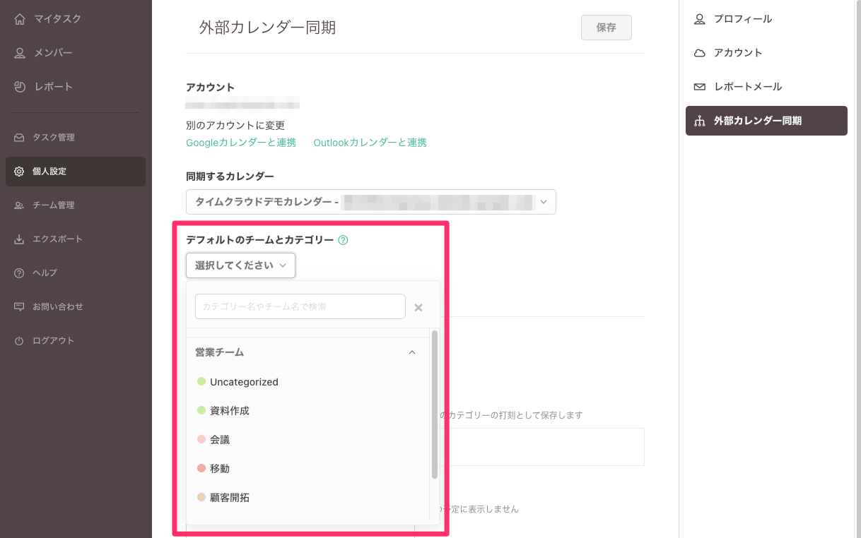 Googleカレンダーの予定で打刻する際は、デフォルトのチームとカテゴリーを設定します。