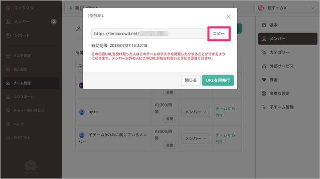 パーソナルプランのチームにメンバーを招待したい場合は、お問い合わせフォームもしくはチャットワークからご連絡ください。