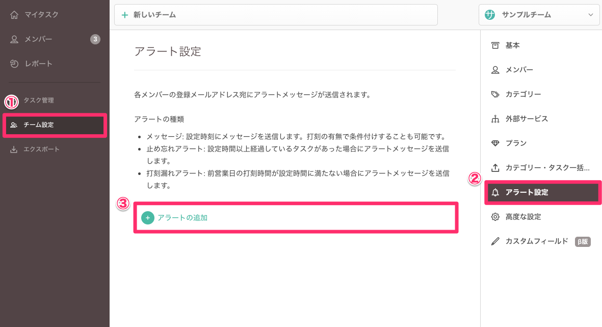 「チーム設定>アラート設定」を開き、「アラートの追加」をクリックします。