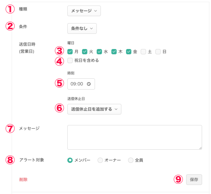 - アラートメッセージの送信時刻を9:00に設定