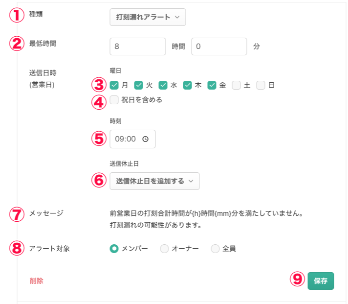 上記の場合、金曜日の合計打刻時間が8時間を満たないメンバーには月曜日の9:00に打刻漏れの可能性がある旨のアラートメッセージが送信されます。