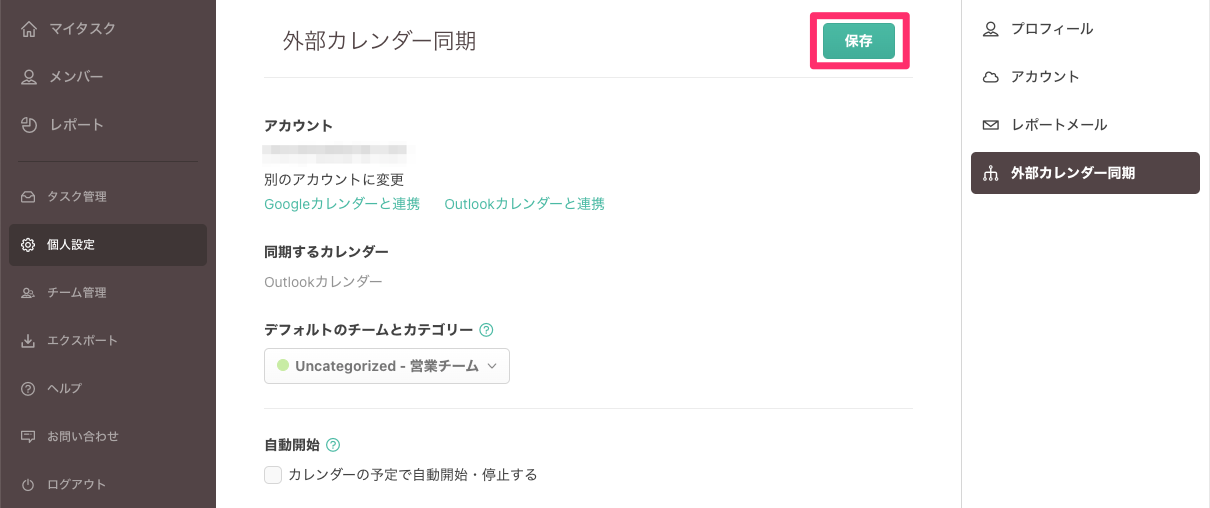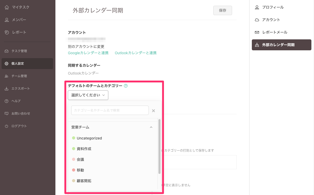 Outlookカレンダーの予定で打刻する際は、デフォルトのチームとカテゴリーを設定します。