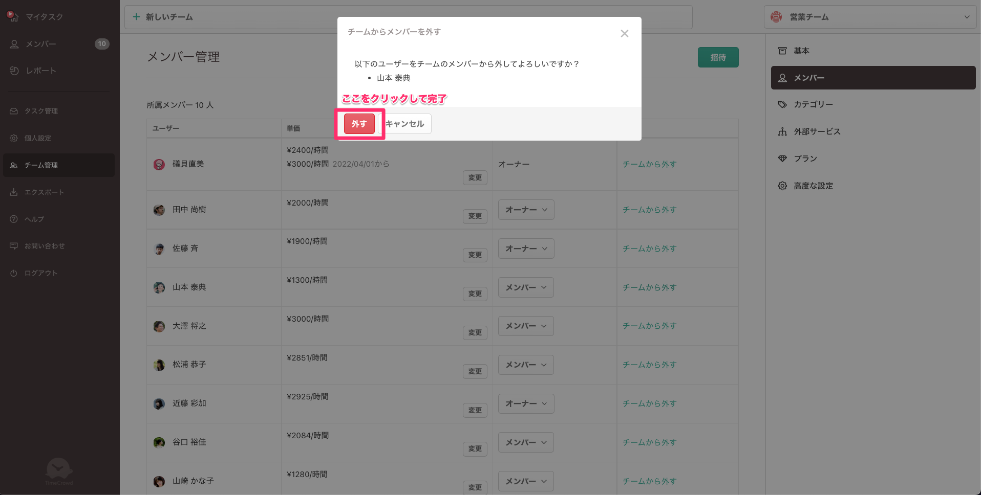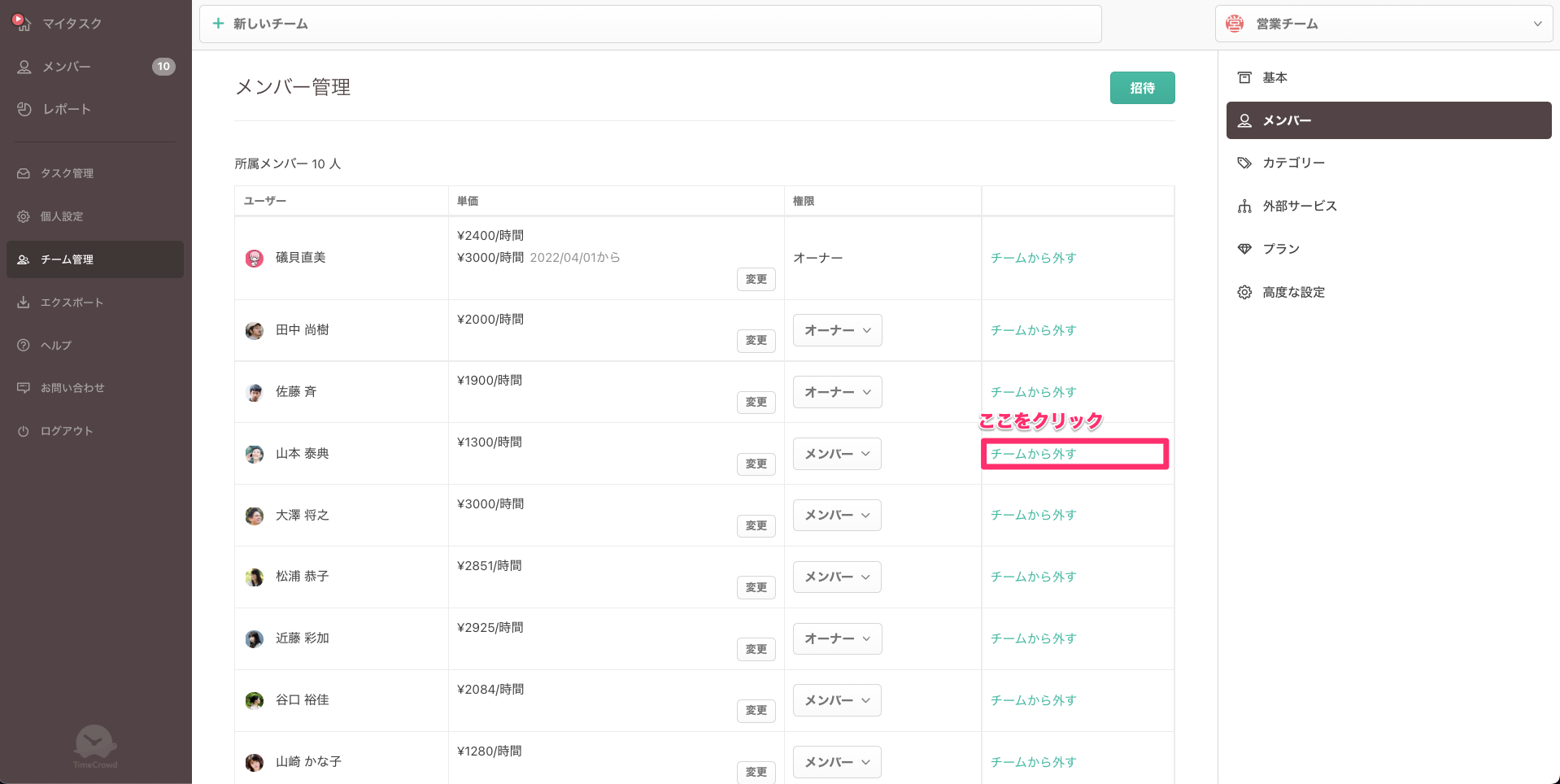 チームから外したいメンバーの右にある「チームから外す」をクリックします。
