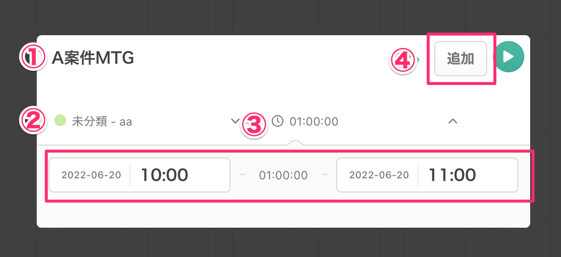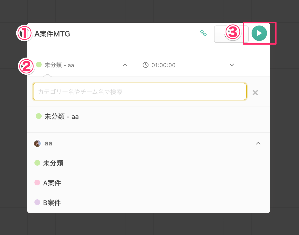 - 「AとMTG」という予定の場合、「◯◯チームのA案件カテゴリー」で打刻する