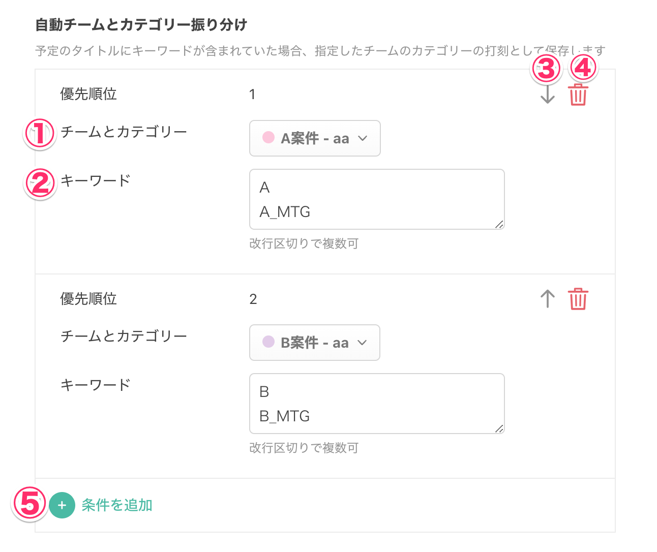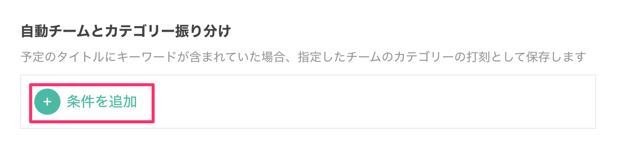 カレンダーの予定のタイトルに指定したキーワードが含まれていた場合に、チームとカテゴリーを自動で振り分けることができます。